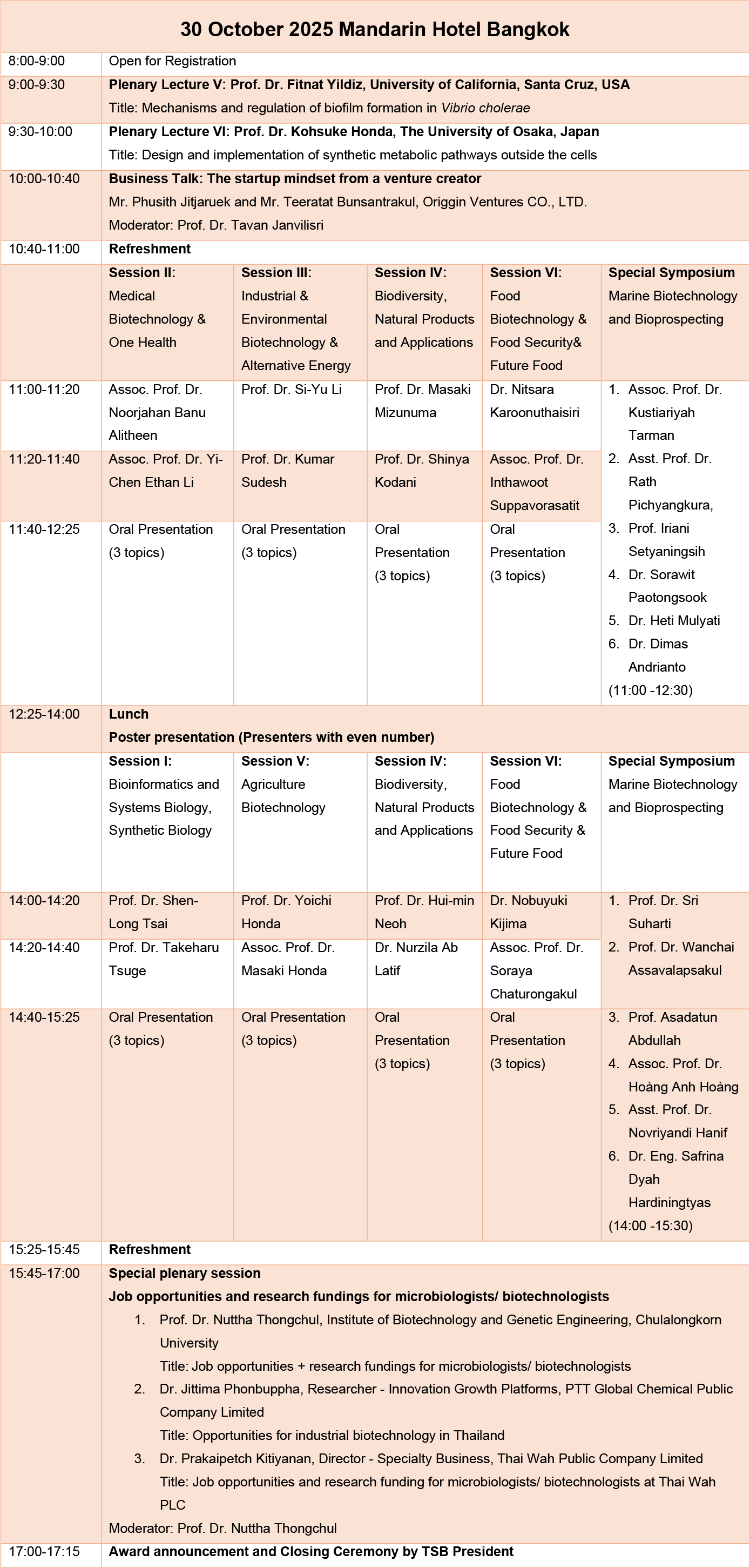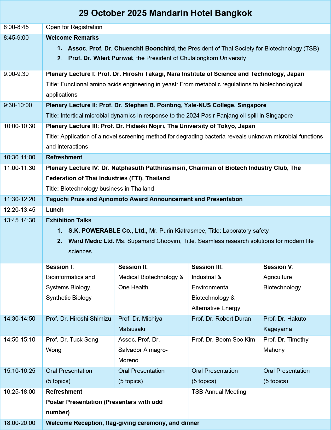Since 1989, the TSB Conference has served as an active platform for sharing the latest advances in biotechnology and encourage collaboration among academic, industrial, and governmental sectors. I would like to express my sincere appreciation to the Faculty of Science and the Institute of Biotechnology and Genetic Engineering, Chulalongkorn University, for their efforts in hosting this year’s conference.