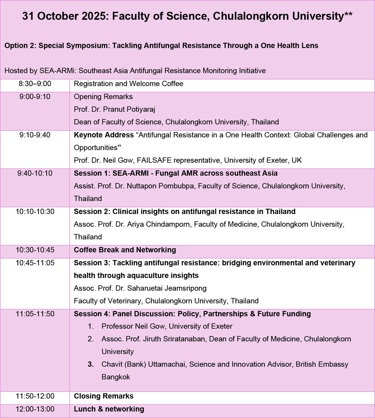 Hosted by SEA-ARMi, this event delves into the critical issue of antifungal resistance. Gain insights from leading experts like Professor Dr. Neil Gow on global challenges, and explore regional and clinical perspectives with Chulalongkorn University's Dr. Nuttapon Pombubpa and Dr. Ariya Chindamporn. Discover how aquaculture research is bridging environmental and veterinary health with Dr. Saharuetai Jeamsripong. Conclude with a dynamic panel discussion on policy, partnerships, and funding.